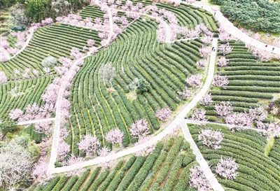 3月15日,游客在浙江省乐清市大荆镇下山头村茶山赏樱游玩(无人机照片)。 新华社发(蔡宽元 摄)