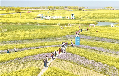 3月20日,游客在江苏省高邮市湖上花海景区赏花游玩(无人机照片)。