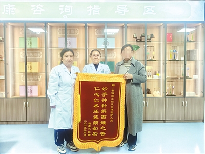 近日,一位患者将一面写有“妙手神针解面瘫之苦,仁心仁术还笑颜如初”的锦旗送到市中医医院治未病中心主任蔡丽萍和全体医护人员手中,感谢为她精心治疗,让她的面部恢复如初。