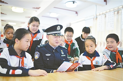 4月13日,在山东省青岛市市北区重庆路第三小学开展的国家安全教育主题活动上,边检站民警为学生讲解国家安全相关知识。