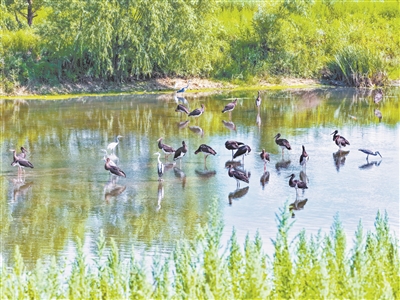 7月25日,一群黑鹳在襄垣县三漳湿地公园栖息、觅食。近年来,襄垣县持续推进湿地修复、水质净化、植被恢复等工作,当地水域生态不断优化,鱼类等水生生物日益增多,为鸟类提供了充足的食物和安全的栖息空间。