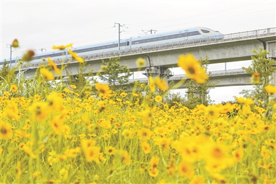 5月5日,一辆列车从安徽省黄山市徽州区西溪南镇的金鸡菊花海旁经过。