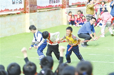 当日,广西梧州市新兴二路小学举行民族体育运动会,比赛设有抛绣球、大象拔河、陀螺、板鞋接力、竹竿舞、跳绳等十多个项目。学生们在运动会中尽享民族传统体育运动带来的快乐。
