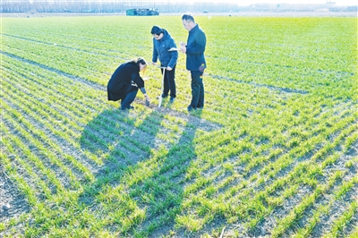 连日来,屯留区农业农村部门组织技术人员深入田间地头指导春耕生产,对村民们普遍关心的种子选择、病虫害防治等关键问题,逐一进行细致解答。图为4月8日,农技人员在李高乡王公庄村麦田查看苗情。