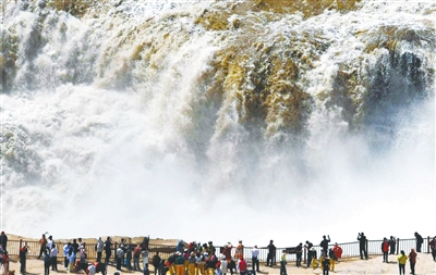 近日,受上游冰凌消融和水库调节放水影响,位于山西吉县和陕西宜川县交界的黄河壶口瀑布迎来一年一度的“桃花汛”,吸引了众多游客。