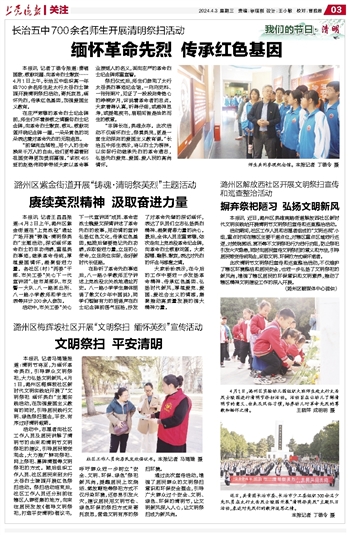 本报讯 近日,潞州区英雄南路街道解放西社区新时代文明实践站开展清明节文明祭扫宣传和巡查整治活动。