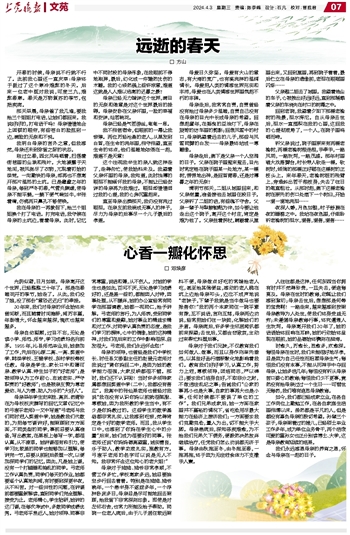 时愈久,历愈长,思愈多,疚愈深。悔恨母亲在世时,我们未能很好地尽孝,总是因为自己任性而招惹母亲生气;悔恨我们没有本事,不能从死神手中夺回母亲,让她多活几年;悔恨没有听从母亲苦口婆心的教诲;悔恨我们少不更事,竟然没有给母亲过过一个生日……可惜世无悔药,我们唯有追思母亲教诲。