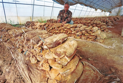 班泽食用菌有限公司灵芝种植基地里,工人正在收集孢子粉。