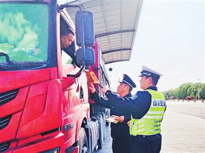 民警向过往司乘人员进行安全宣讲。 本报记者 韦婧 摄