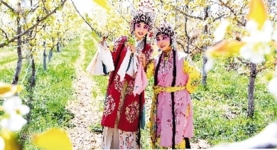 游客穿着戏服在梨园合影留念。 本报记者 张国平 摄