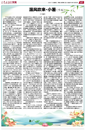 时至小暑节气,热风吹拂,湿气蒸腾。《易·系辞上》说:“日月运行,一寒一暑。”这一冷一热的两极,是时光流转的自然规律。人,就是顺应着这样的天地时序来休养生息。小暑,意思就是“小热”,指天气开始炎热了,但还没有到最热的时候。故《月令七十二候集解》说:“六月节……暑,热也,就热之中分为大小,月初为小,月中为大,今则热气犹小也。”热到极致的时候应该是大暑节气。小暑大暑相连而至,这一个月内扑面而来的都是滚滚热浪。二十四节气虽然是古人根据黄河流域一带的气象、物候制定的,但到了盛夏,南北方的气温差异不大,均十分炎热,故民间有“小暑大暑,上蒸下煮”之说,只是南方的湿气比北方更甚,正所谓溽暑时节也。