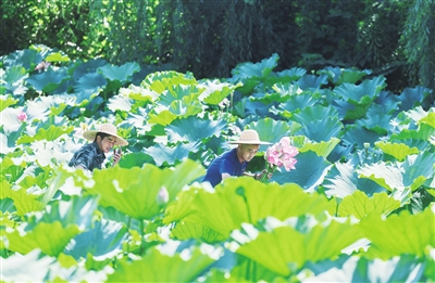 7月4日,泉心村的村民乘船在荷塘里采摘荷花、莲蓬。