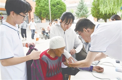活动中,实践队为村民讲解健康生活方式和急救基本技能,并通过演绎情景剧,形象具体介绍预防传染病的知识。图为志愿者为老年人免费测量血压。