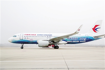 当日,东航首架“亚冬号”彩绘机执飞MU6347航班,搭载首航旅客从上海虹桥国际机场抵达哈尔滨太平国际机场。