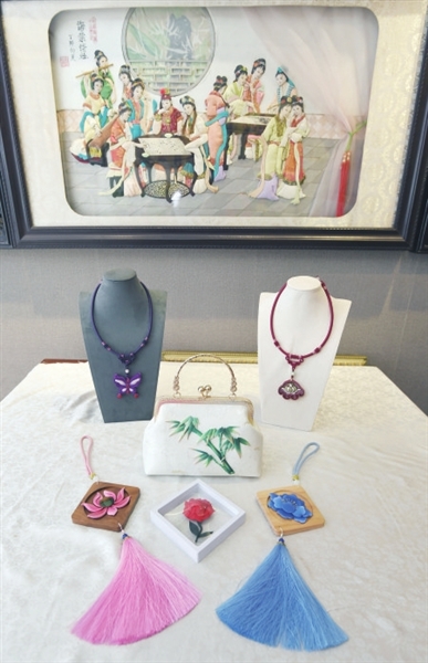 韩玲既守堆锦技艺之正,又大胆创新。选材别出心裁,如作品《杮杮如意》《莲蓬》,巧妙巧用物料展示物态之美。同时,积极探索新产品,将堆锦融入校徽、服装、皮包、胸针、车挂、杯垫等日常用品中,让古老堆锦焕发出时尚活力,开启传承新篇。