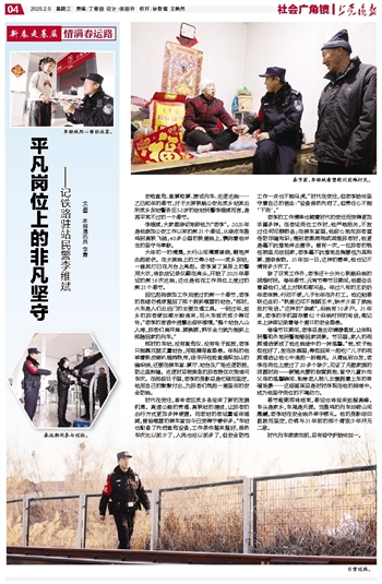 每逢节日期间,老李总是主动请缨值班,让年轻民警和外地民警能够回家团聚。节日里,家人的视频通话便成了他巡线途中的一抹温馨。“爸,饺子给您包好了,放在冰箱里,等您回来一起吃!”儿子的视频通话让他心中涌起一股暖流。从青丝到白发,老李在岗位上度过了20多个除夕,见证了无数家庭的团圆时刻——新婚夫妻的甜蜜拥抱、留守儿童扑向父母的温馨瞬间、轮椅老人被儿女簇拥着上车的幸福场景……这些画面总是时时浮现在他的脑海中,成为他坚守岗位的不竭动力。