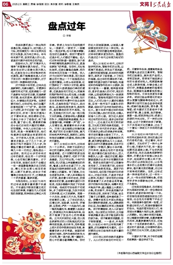 从20世纪80年代到今天,过年的形式始终未变,变化的是过年的内容和内涵。你过着年,年亦过着你。无论你怀了一种什么样的心绪,只要岁月不老,年一直会如期而至盛装上演;不论你抗拒还是欢迎,年永远是亮丽新鲜的模样,尽管这其中有难以抹去的旧岁,但迎新的主题从来不变。所以我们必须告别过去,以乐观淳朴的心态和博大的情怀去拥抱新年,像天真无邪的稚童,对过年只有单纯的期盼。当然,过年还是一种体验和成长,过一年长一岁,从一张白纸到写满沧桑,你我有许多快乐都献给过年,才能够不负韶华。