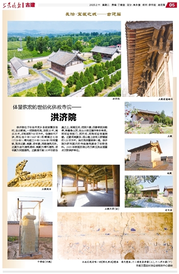 洪济院位于长治市武乡县故城镇东良村,坐北朝南,一进院落布局,东西20米,南北35米,占地面积700平方米。创建年代不详,明弘治十年(1497年)和清雍正七年(1729年)、清光绪三十年(1904年)均有重修,现存正殿、南殿、老爷殿,两侧建筑无存,正殿为金代建筑遗构、南殿为清代建筑、老爷殿为民国建筑。正殿建于高1.6米石砌台基之上,面阔五间,进深六椽,四椽栿前后剳牵,单檐悬山顶,柱头斗栱五铺作单杪单昂,明间设有板门、两次间、两稍间设有直棂窗。正殿和南殿东、西山墙上绘有人物壁画约120平方米。庙内现存重修碑1通。洪济院为研究国内的寺庙建筑提供了实物资料。2001年被国务院公布为第五批全国重点文物保护单位。