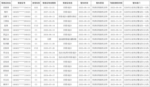 以下18名机动车驾驶人在一个记分周期内累积记分满12分,收到满分教育通知书后三十日内拒不参加公安机关交通管理部门通知的满分学习、考试或经考试仍不合格的,根据《中华人民共和国道路交通安全法实施条例》第二十三条、二十五条和《道路交通安全违法行为记分管理办法》(公安部163号令)第二十九条之规定,自本公告发布之日起,长治市公安局交通警察支队将公告其机动车驾驶证停止使用。