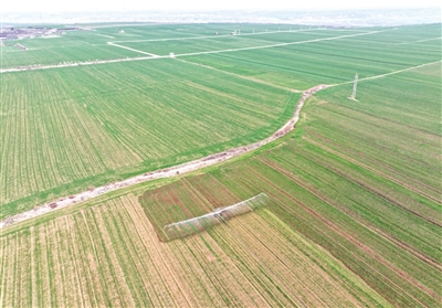 3月6日,在西安市长安区神禾塬万亩优质粮食生产基地,农机专业合作社社员使用淋灌机浇灌小麦(无人机照片)。