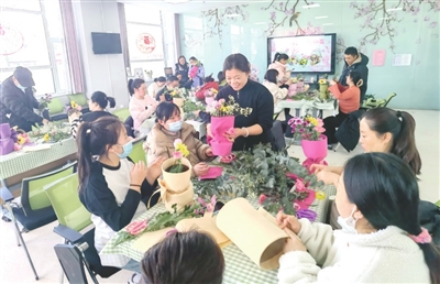 3月8日,长治市计划生育协会联合市妇幼保健院在孕妇学校开展庆“三八”插花活动,受邀请的孕妈妈们欢聚一堂,在花香四溢、欢声笑语中学习插花技术。活动现场,还围绕科学避孕,保护女性生育力、避免出生缺陷、科学育儿等相关知识和政策,为准妈妈们进行了科普知识宣传。 本报记者 张海 摄