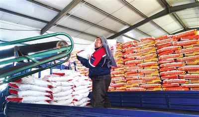 3月12日,在壶关县农业生产资料公司仓储库内,工作人员正在把化肥装车,配送到各乡镇村庄,做好春耕生产所需农资储运工作,确保春耕作业顺利开展。
