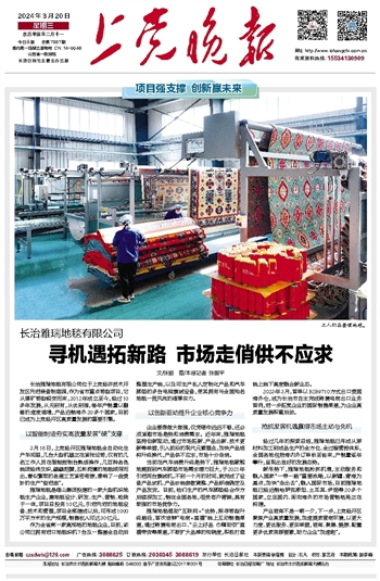 3月16日,上党经开区雅瑞地毯全自动化生产车间里,几台大型机器正在紧张运转,仅有的几名工作人员在智能控制台熟练操作,几百种各色线团经纬交织,翩翩起舞,五彩斑斓的地毯倾泻而出,看似繁琐的各道工艺紧密衔接,奏响了一曲美妙的生产“奋进曲”。