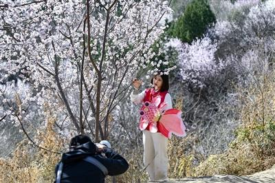 3月20日,游客在北京园博园桃花谷赏花留影。近日,北京园博园桃花谷山桃花次第绽放,吸引游客前来赏花踏青。