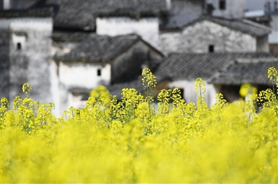 时下,安徽省黄山市歙县新安江畔油菜花连绵铺展,春意盎然。