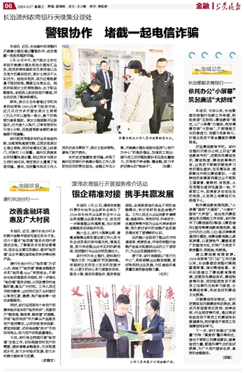 本报讯 近日,建行长治分行乡村振兴金融专班到屯留区和长子县,对六个重点“裕农通”服务点进行穿透式巡检,了解服务点目前运营情况、征求业主意见和建议、宣讲“裕农通”业主专属权益和裕农快贷等优势产品。