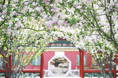 这是故宫里的海棠花(4月7日摄)。 春日里的故宫,各种花卉竞相绽放,姹紫嫣红,美不胜收。 新华社记者 金良快 摄