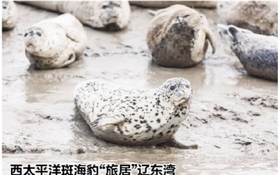 4月9日,西太平洋斑海豹在辽宁盘锦三道沟海域的滩涂上休息。