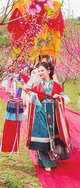 花朝节,又称百花生日,是我国古代十分重要的民间传统节日,这一天,人们会穿上美丽的汉服,赏花、踏青、祈福,共同庆祝春天的到来。置身米家桃花谷,放眼望去,随处可见头戴簪花、身着汉服的游客往来穿梭、踏青赏春,三五成群相约观看“花神”走秀、真人复原唐代名画《捣练图》表演,体验投壶、射箭等传统游戏,成为市民手机中定格的一个个美丽瞬间。