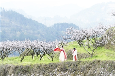 3月23日,游客在贵州省遵义市余庆县白泥镇哨溪村赏花游玩。
