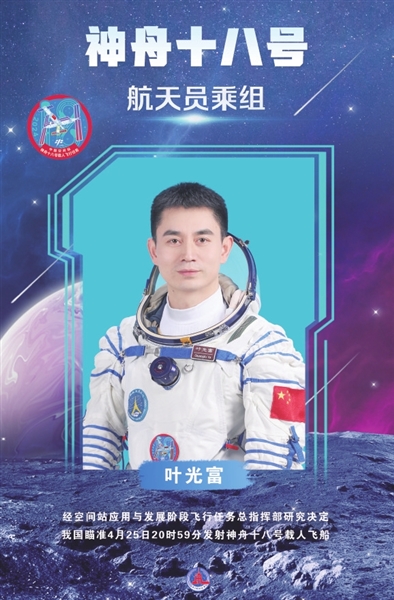 执行神舟十八号载人飞行任务的航天员乘组由叶光富、李聪、李广苏3名航天员组成,叶光富担任指令长。