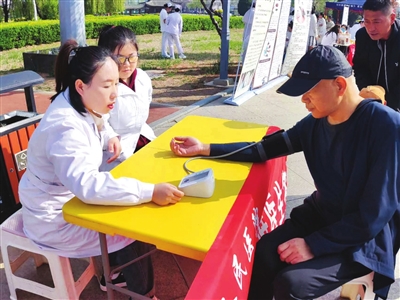 本报讯 记者马嫣婕报道:“大叔,您的血压有点高,平时要注意饮食清淡。”5月7日,潞州区英雄南路街道下南社区新时代文明实践站联合市二院社区卫生服务中心在南广场开展“义诊送健康,服务暖人心”志愿活动。此次活动旨在提高社区居民的健康素养,宣传中医文化,推广康复理疗相关知识和理念。