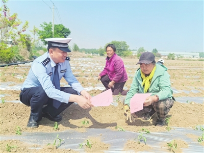 “驾驶农用车过三岔路口时,一定要注意观察路况……”“骑电动自行车上路时要戴上头盔。”在农民栽种辣椒现场,交警趁着村民休息的间隙,面对面与他们聊春耕、说交通、话安全,向栽种辣椒群众发放交通安全法律知识宣传单,讲解农用车违法载人、面包车超员、人货混载等交通违法行为的危害,并倡导村民将交通安全知识向亲朋好友广泛宣传,引导带动更多交通参与者提高安全出行意识。