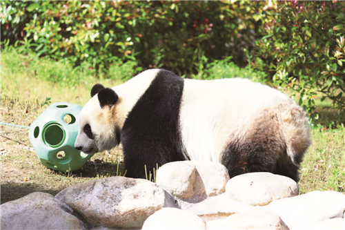 5月12日,在南京汤山紫清湖野生动物世界,大熊猫“团子”在玩耍。