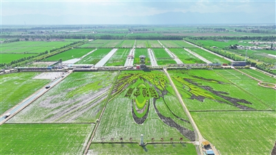 近日,在位于宁夏银川市贺兰县的稻渔空间乡村生态观光园里,巨幅稻田画进入最佳观赏期,吸引游客前来观赏。