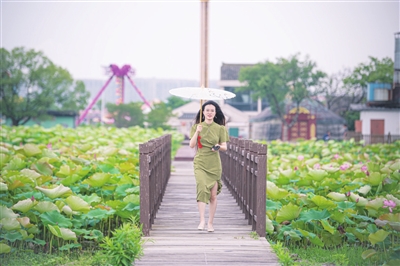 夏至节气将至,浙江省宁波市江北区外漕村百亩荷田的荷花绽放、荷叶连绵,吸引市民前来赏荷游玩。