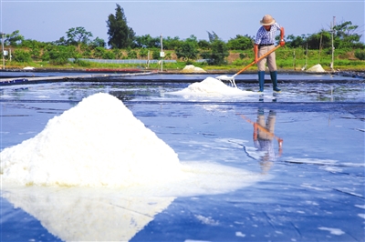 6月22日,在浙江省温州市乐清湾畔的南塘晒盐场,工人在晒盐。