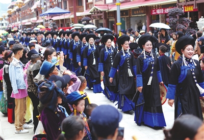 7月22日,在传统火把节银饰、服饰展演活动中,当地群众身着彝族传统服饰走在布拖县城大街上。