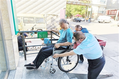 考虑到老人的实际情况,业务办理完成后郭彦鑫小心搀扶其坐上爱心轮椅,与客户一起将老人送至小区门口,途中细心与老人交谈,告诉周大爷如有需求该支行可以提供上门服务。
