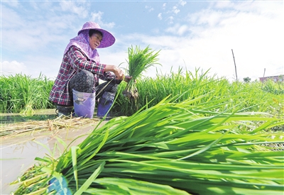 7月30日,在福建省泉州市泉港区一处育秧田,农民忙着采收秧苗,准备抢插晚稻。