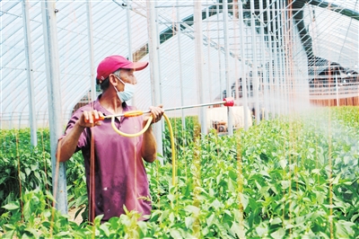 在西旺村成片的种植园区里,一排排蔬菜大棚整齐划一、相连成片,大棚内青(尖)椒、西红柿、韭菜长势喜人,种植户们忙着喷水、撒药、管护……一派繁忙景象。