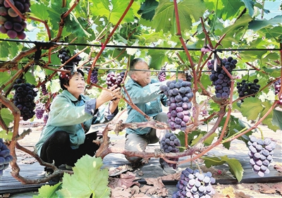 “采摘、包装、除草、修理葡萄树,我们都能做,一天有100多元的收入,离家近还能挣工资,生活一天比一天好了。”村民赵云霞一边给葡萄打包称重一边说。