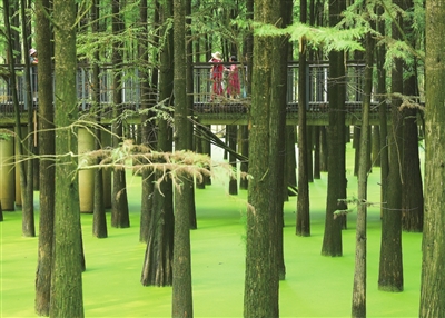 初秋时节,杭州青山湖水上森林近百亩池杉、落羽杉和水面的浮萍相映成趣,呈现出幽静的生态景观。