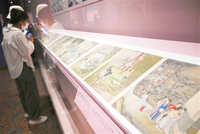 9月4日,参观者在北京故宫博物院观看月曼清游图册。