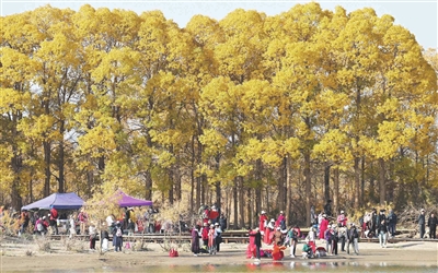 10月13日,游客在内蒙古阿拉善盟额济纳旗额济纳胡杨林旅游区游玩。
