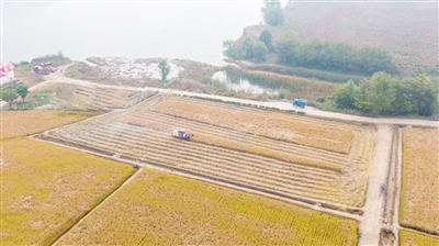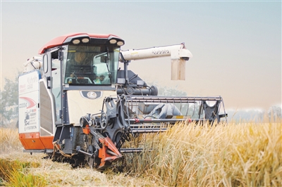 在襄垣,农业机械已成为农业生产的主力军,收割机代替了传统的人力收割,割稻、脱粒、碎杆、装车一气呵成。“机械收割省时省力更省心,大概两天时间,就能完成百十亩水稻的收割。今年是第一年试种,按照目前收获情况来看,每亩产量能达到800-1000斤左右。”“襄缘·花海”幸福田园农业种植项目管护人员张江滨介绍。